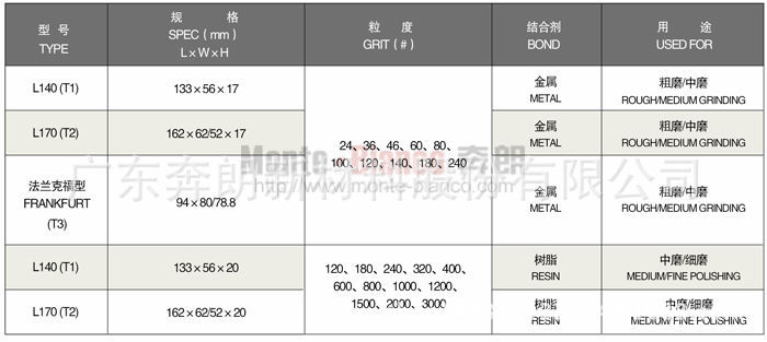 说明: 适用于不同硬度的大理石、花岗岩、人造石英石板材表面的磨平抛光。 可根据磨机的卡口形状提供各种类型的磨块:布拉型(T1、T2 )、马蹄型(T3)。 适用于所有自动连续磨机和单头磨机。